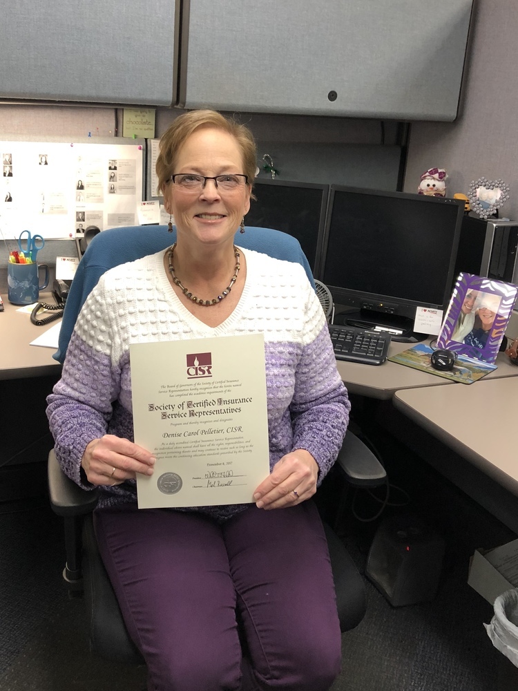 A big congratulations to Customer Service Representative Denise Pelletier for earning her Certified Insurance Service Representative (CISR) designation. We are very proud of all your hard work and for passing all five of your exams!