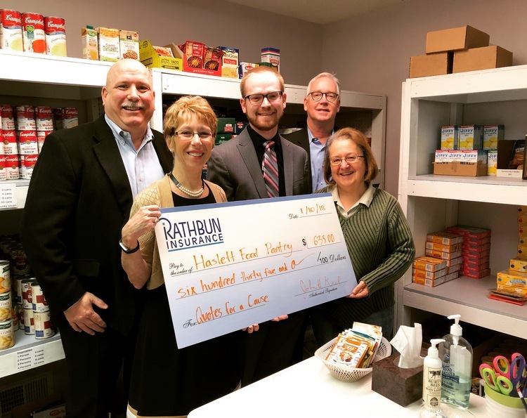 For our December Quotes for a Cause campaign, we partnered with the Haslett Food Pantry. We stopped by Haslett Community Church this morning to present the Food Pantry with a check for $635! The Haslett Food Pantry has been part of the Greater Lansing Food Bank for over thirty years and assists, on average, 75 families per month. If you would like to make a donation directly to the Food Bank, check out their website.