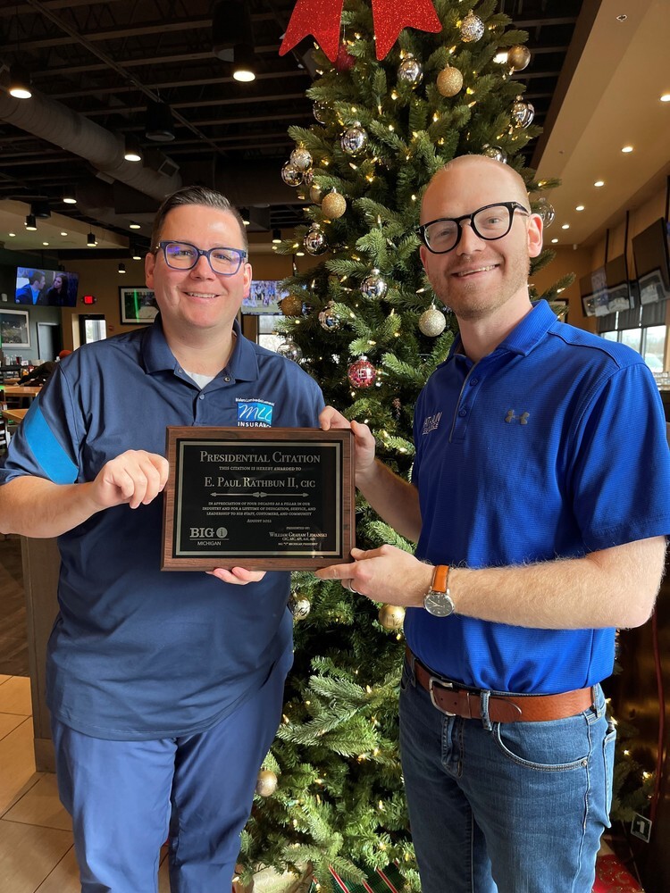 We were honored today to receive a Presidential Citation from Big "I" Michigan for Paul Rathbun. Past President Will Lemanski was able to present the award to current agency President Ben Rathbun.