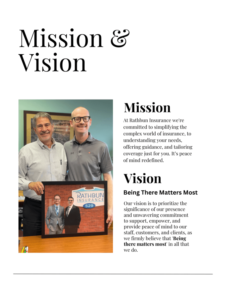 We are beyond thrilled to unveil the culmination of a year-long journey, a transformative process that has inspired Rathbun Insurance. Guided by the Small Business Development Center's Focus Four curriculum, and fueled by our 67-year legacy, we're proud to present our refreshed Mission, Vision, and Values.