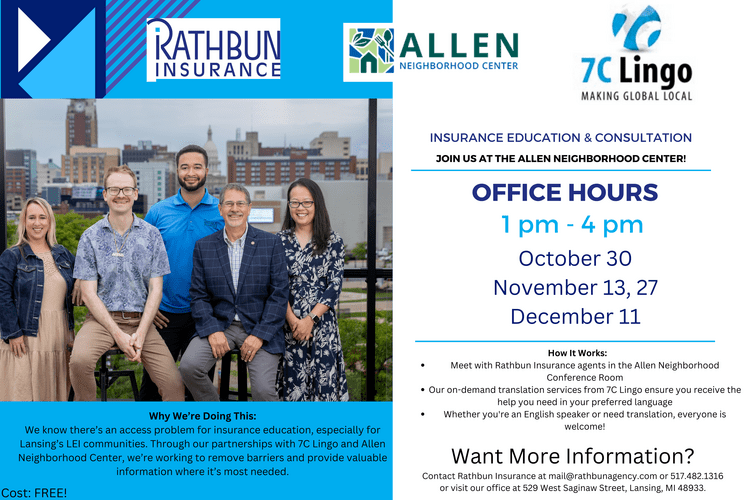 At Rathbun Insurance, we believe that “Being There Matters Most.” Our commitment to the Lansing community continues to evolve through thoughtful partnerships, such as our ongoing collaboration with 7C Lingo and local nonprofits. We are excited to announce a new initiative in partnership with Allen Neighborhood Center(ANC) to address the significant barriers to insurance access faced by many, particularly Limited English Individuals (LEI).