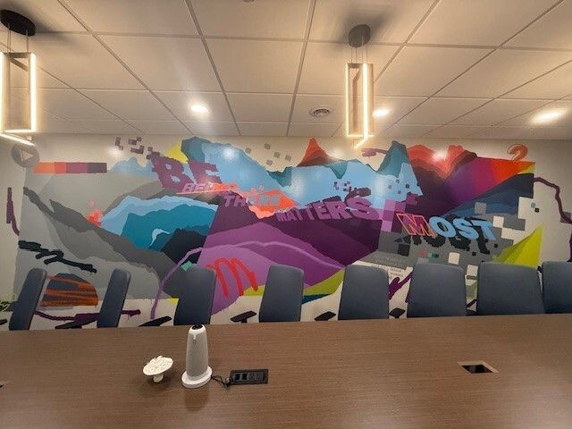 The result? A bold, abstract mural anchored by our agency’s guiding words: “Being There Matters Most.” It now lives proudly on the wall of our conference room, flanked by our four vision symbols — a colorful, powerful reminder of what we stand for.