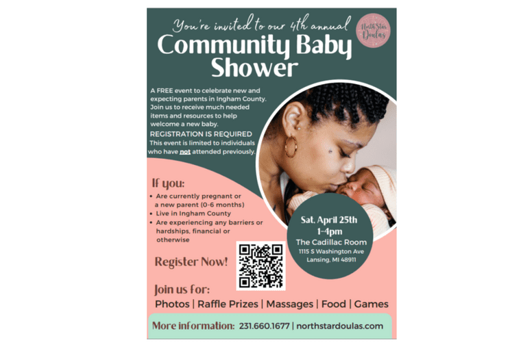 The Community Baby Shower is a FREE event held to celebrate new and expecting parents in the Greater Lansing area. More than just a celebration, this event provides essential baby items, education, and access to important local resources to help families feel supported and prepared for birth and the postpartum journey. All expecting or postpartum parents attending must complete registration in advance to participate.